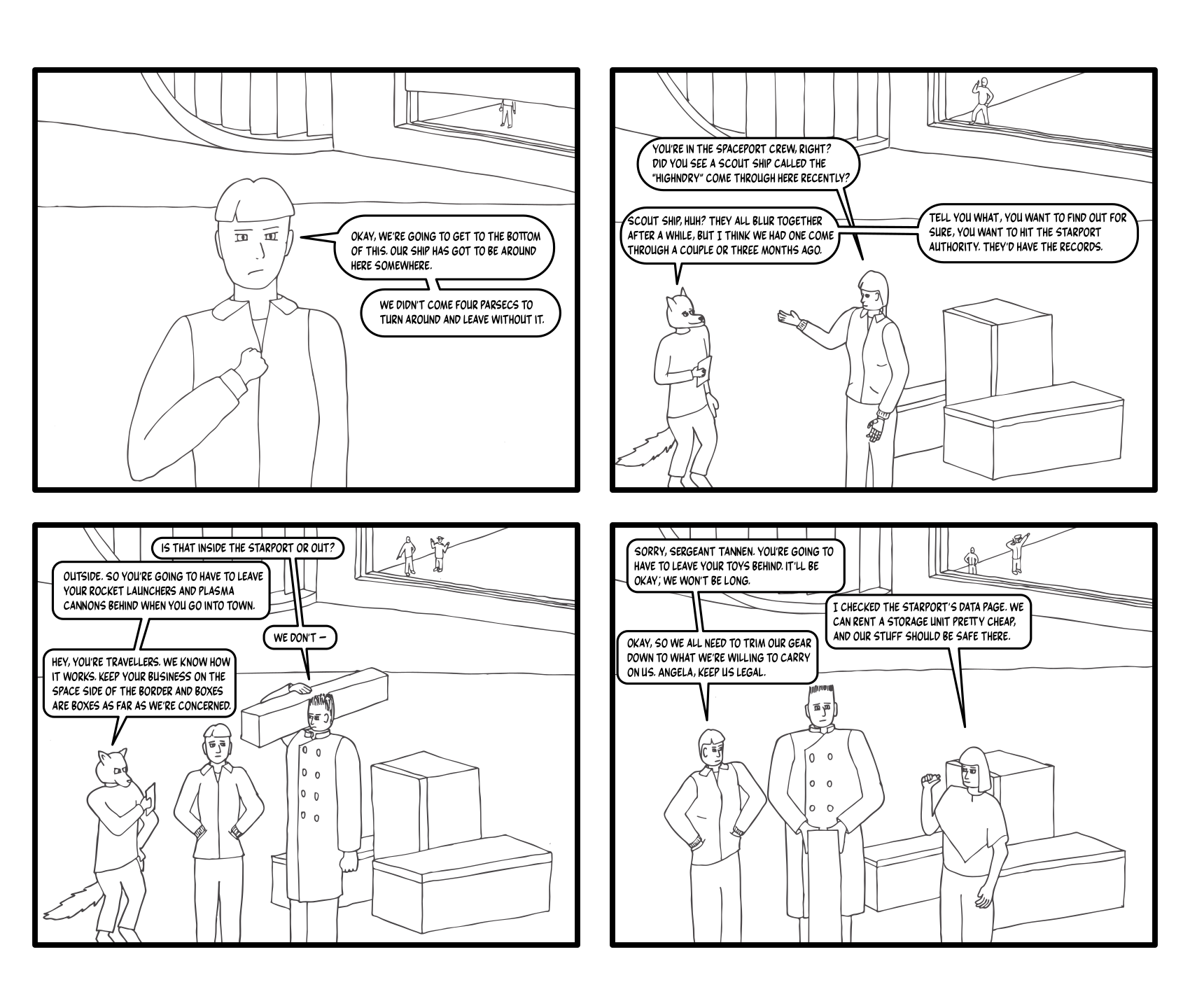 Back on schedule, as I’ve defined it! I believe this marks the first time we’ve seen the camera stay in one place for this long. I’ve felt that the comic so far has been “choppy” and I’m trying to correct that. Now I just have to make sure I don’t overcorrect and give you long pages of dialogue! Anyway, here’s today’s progress.